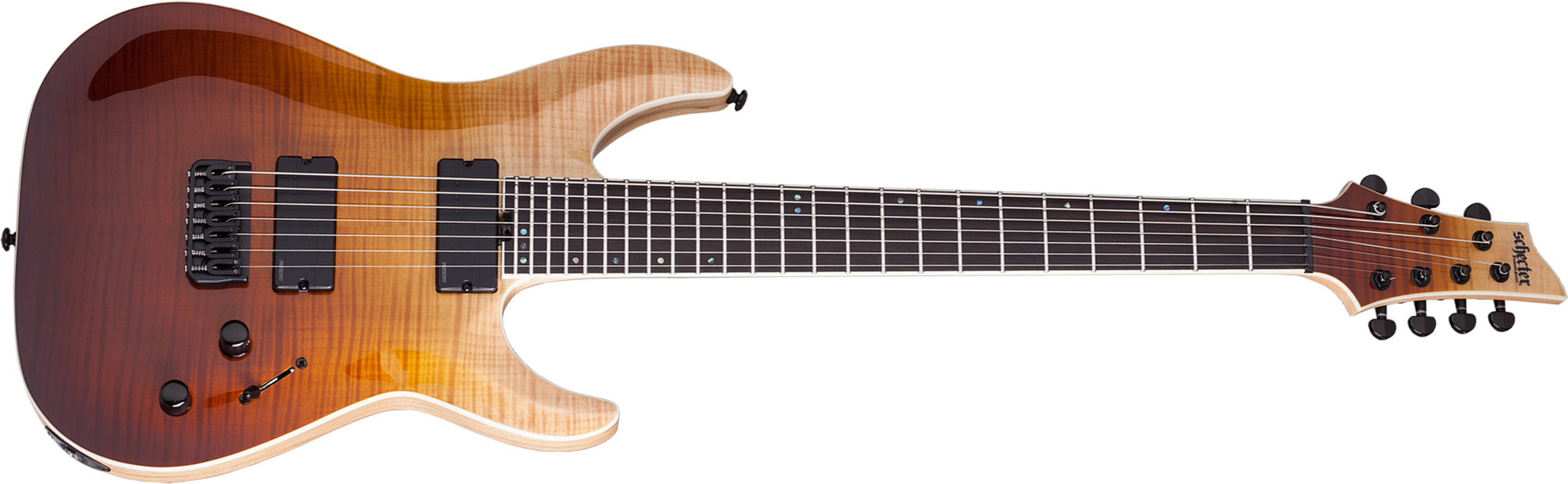 The SCHECTER C-7 SLS Elite (1354) is a 7-string baritone solid body electric guitar, splendid iteration of the benchmark C-1 with Swamp Ash body, flamed Maple top, multi-woods neck-thru-body, 24 frets Ebony fretboard, active/passive Fishman Fluence Modern pickups, and Hipshot fixed bridge.