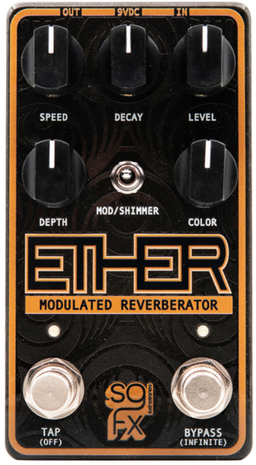 SOLIDGOLDFX Ether Modulated Reverberator compact effect pedal delivers vast ambient and shimmering soundscapes. With endless tails, the pedal is further manipulated by Tap Tempo Vibrato, Tremolo and Harmonic-Tremolo, all designed to bring you to a realm of dark, cavernous voids and eerie, yet shimmering reflections. Ambient bliss is only a stomp away.