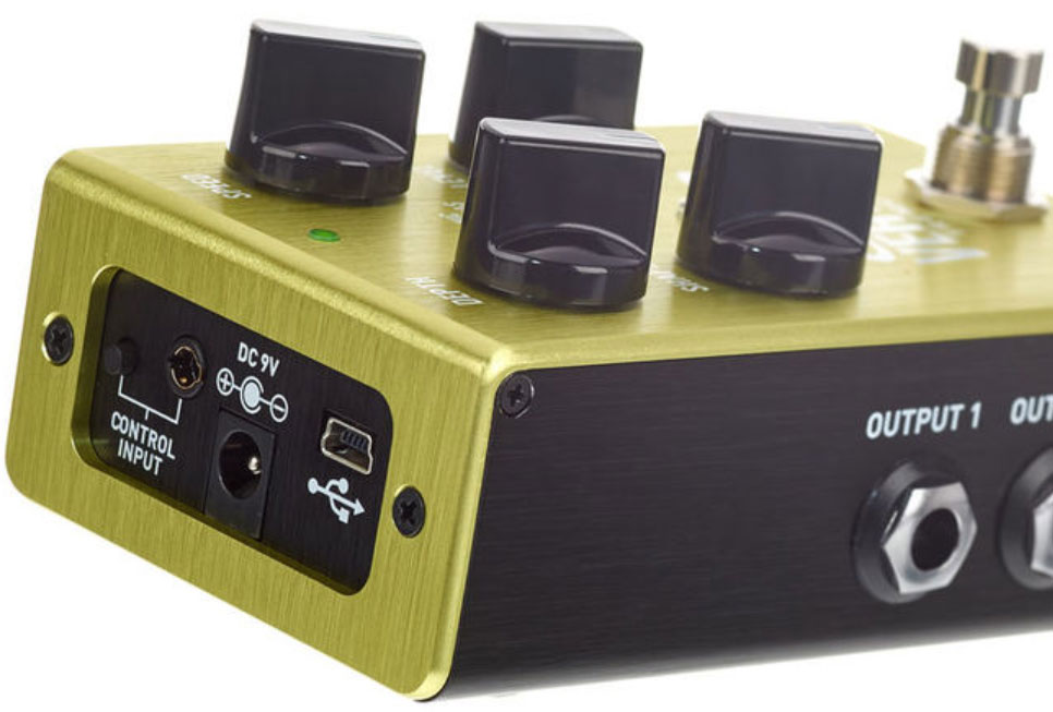 - Stereo Input and Output Jacks — Distort upstream stereo signals, split a mono signal to dual outputs, or use the additional in and out as an external effects loop