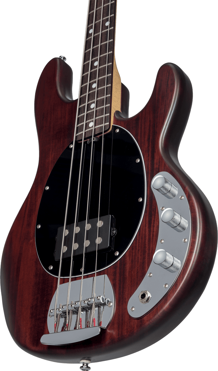 The STERLING BY MUSIC MAN SUB StingRay RAY4 (Jatoba, Walnut Satin) solid body electric bass features a Jabon or Basswood modern contoured body, Maple neck, Jatoba or Maple neck depending on colors, humbucking pickup with ceramic magnets, a 2-band active preamp, and a bridge modeled after the iconic Ernie Ball Music Man StingRay.