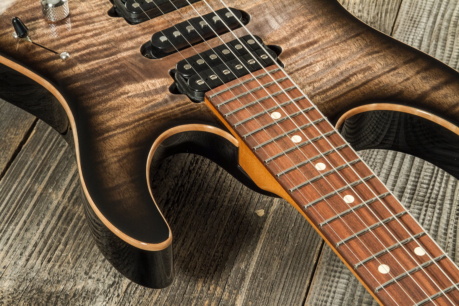 A two pieces Basswood body, two pieces flame Maple top, paired with a roasted Maple bolt-on neck and Pau Ferro fretboard (Modern Elliptical profile, 24 jumbo stainless-steel frets).