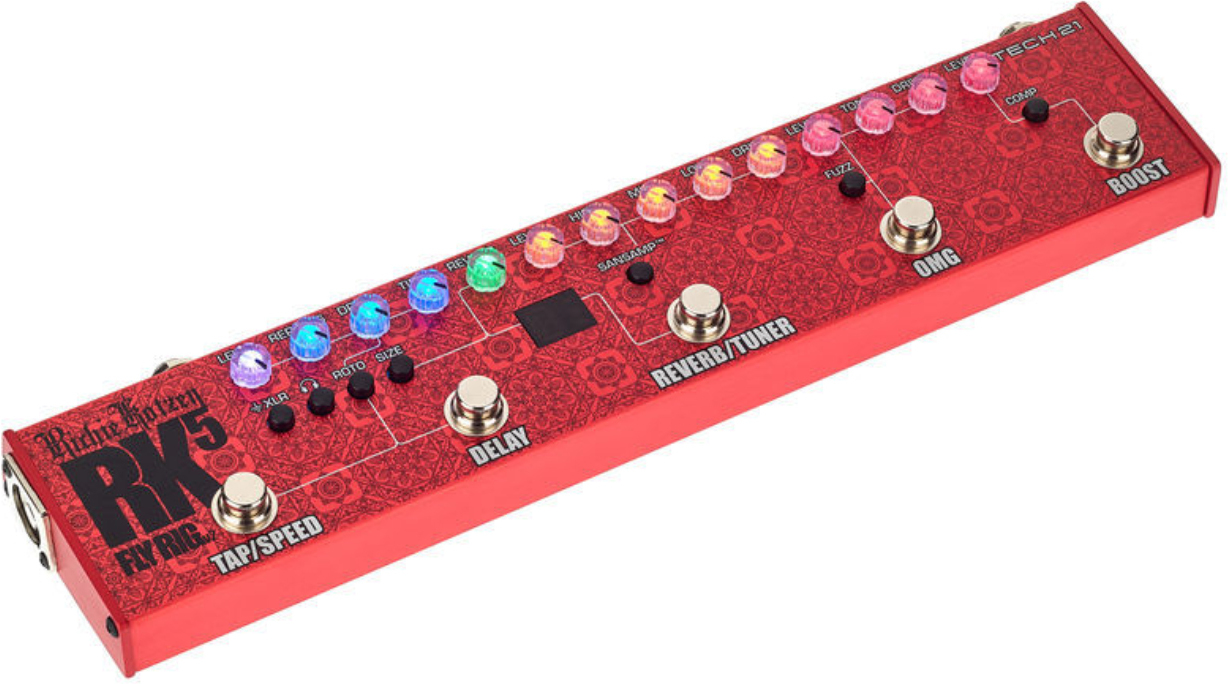 The RK5 v2 retains the same delay with tap tempo, a powerful boost, and Richie’s Signature OMG overdrive. New features include an independent reverb with choice of room size, a rotary speaker mode, compression, fuzz, a tuner, headphone capability and an XLR Output.