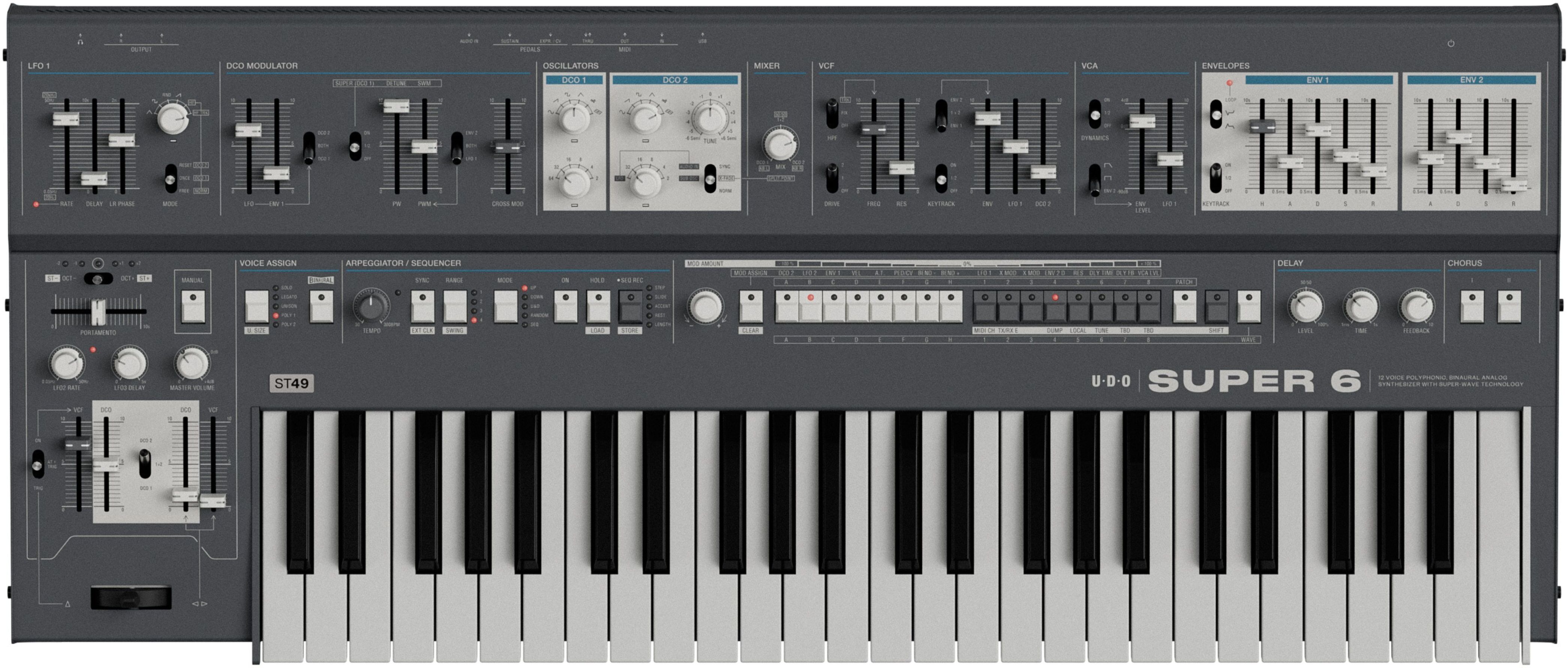 The Super 6 ST49 Black is a synthesizer offered by the UDO Audio brand.