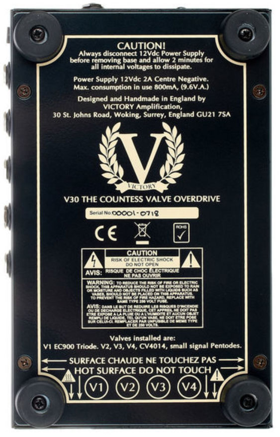 VICTORY V4 The Countess is a preamp effect pedal for electric guitar, featuring 4 tubes and 2 channels.