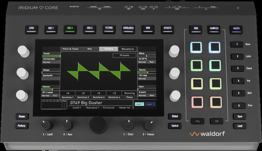 Iridium Core shares the same software platform like Quantum, Iridium Desktop & Iridium Keyboard. All instruments are powered by the Waldorf synthesiser OS and will receive joint updates. Thus, the whole family participates from future enhancements and developments.
