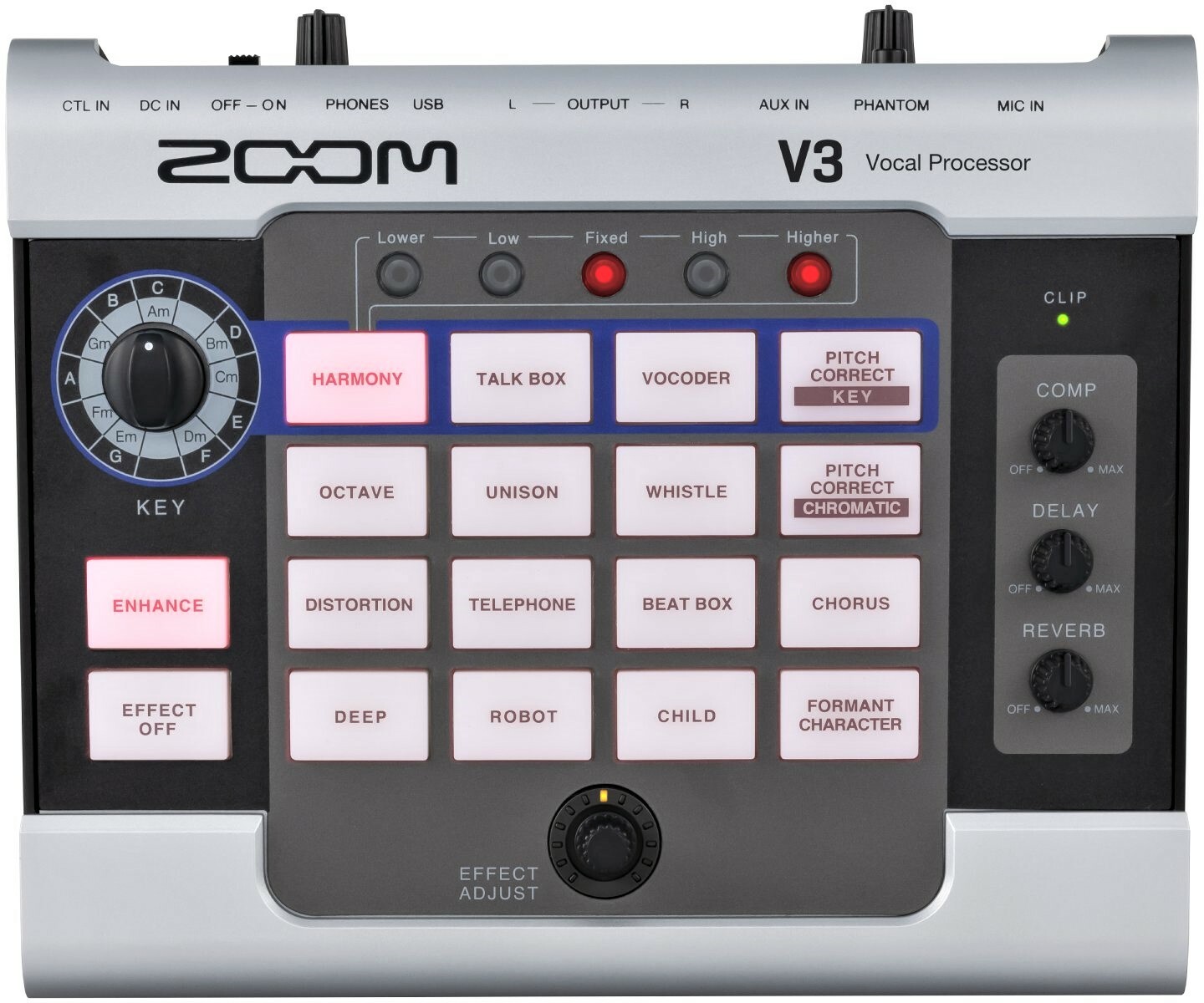 Whether you are streaming, recording or collaborating online: give your voice a new dimension with ZOOM V3! This voice processor has 16 effects, including form control, 3-part harmonizer, pitch correction, vocoder ... But also independent effects like reverberation, delay and compression with dedicated controls to refine your voice.